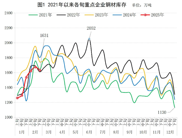 2025年2月下旬,重點(diǎn)統(tǒng)計(jì)鋼鐵企業(yè)(以下簡(jiǎn)稱“重點(diǎn)企業(yè)”)鋼材庫(kù)存量1631萬噸,環(huán)比上一旬減少42萬噸,下降2.5%;比年初增加394萬噸,增長(zhǎng)31.9%;比上月同旬增加96萬噸,增長(zhǎng)6.3%;比去年同旬減少171萬噸,下降9.5%,比前年同旬減少111萬噸,下降6.4%(見圖1)。