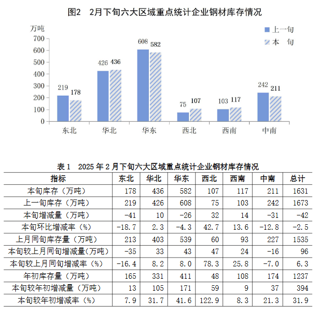 2月下旬六大地區(qū)中,華北、西北、西南地區(qū)重點(diǎn)企業(yè)鋼材庫(kù)存較上一旬有不同程度增長(zhǎng),其它地區(qū)均有不同程度下降(見圖2、表1),具體情況為: